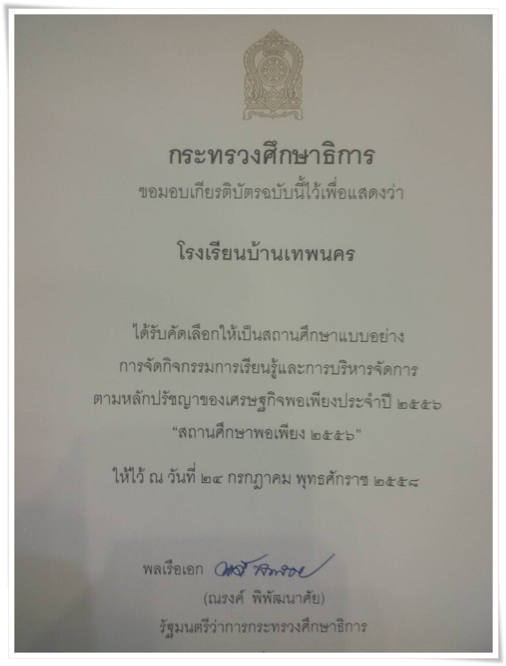 โรงเรียนบ้านเทพนคร รับเกียรติบัตร "สถานศึกษาพอเพียง ๒๕๕๖"