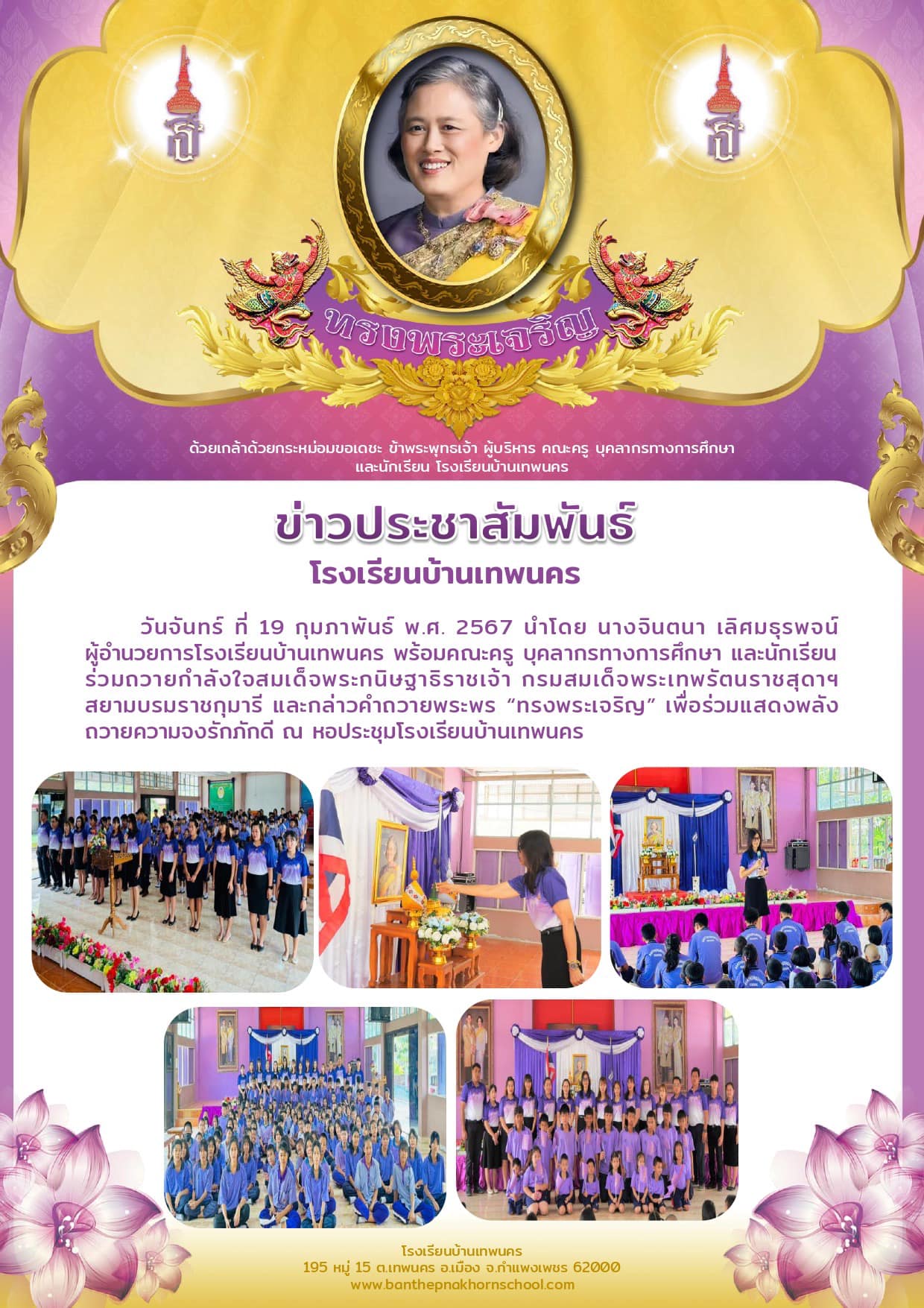 ผู้บริหาร คณะครู บุคคลากทางการศึกษา นักศึกษาฝึกประสบการณ์วิชาชีพครู และนักเรียนโรงเรียนบ้านเทพนครรวมพลังน้อมถวายกำลังใจแด่สมเด็จพระกนิษฐาธิราชเจ้า กรมสมเด็จพระเทพรัตนราชสุดาฯ สยามบรมราชกุมารี