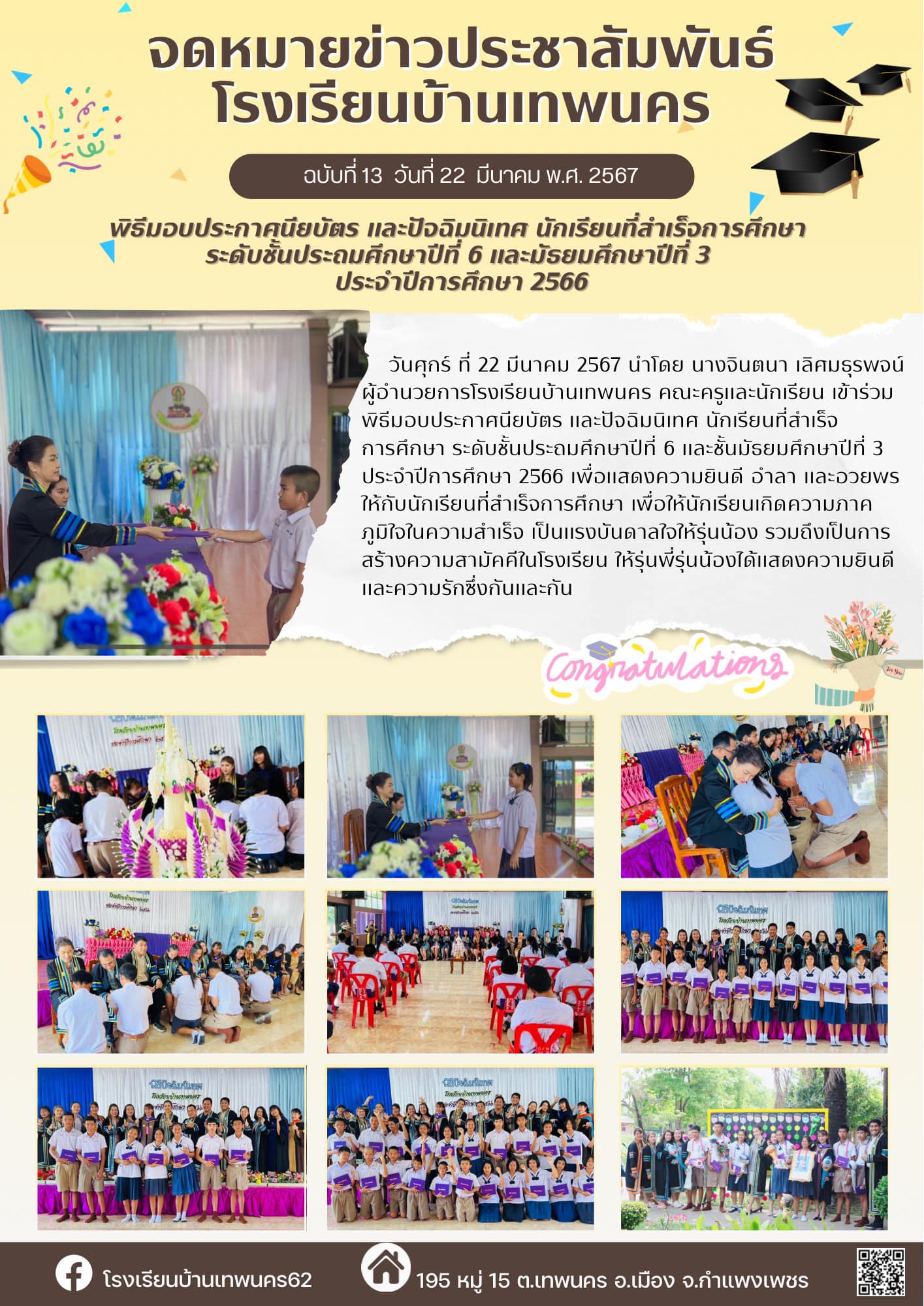 พิธีมอบประกาศนียบัตร และปัจฉิมนิเทศ นักเรียนที่สำเร็จการศึกษา ระดับชั้นประถมศึกษาปีที่ 6 และชั้นมัธยมศึกษาปีที่ 3