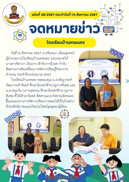 | โรงเรียนบ้านเทพนคร ขอขอบคุณนางสาวพัสฏาพรห์ วัฒนากรคำจันทร์ และนางสาวปทุมวัน กลางสุพรรณ ศึกษานิเทศก์ชำนาญการพิเศษ ที่ได้เข้ามานิเทศ กำกับ และติดตาม การขับเคลื่อนการจัดการเรียนรู้วิทยากาคำนวณและการออกแบบเทคโนโลยี (CODING) แบบกัลยาณมิตรและชี้แนวทางการจัดการเรียนการสอนให้เป็นไปอย่างมีประสิทธิภาพและเกิดประโยชน์สูงสุดแก่ผู้เรียน |