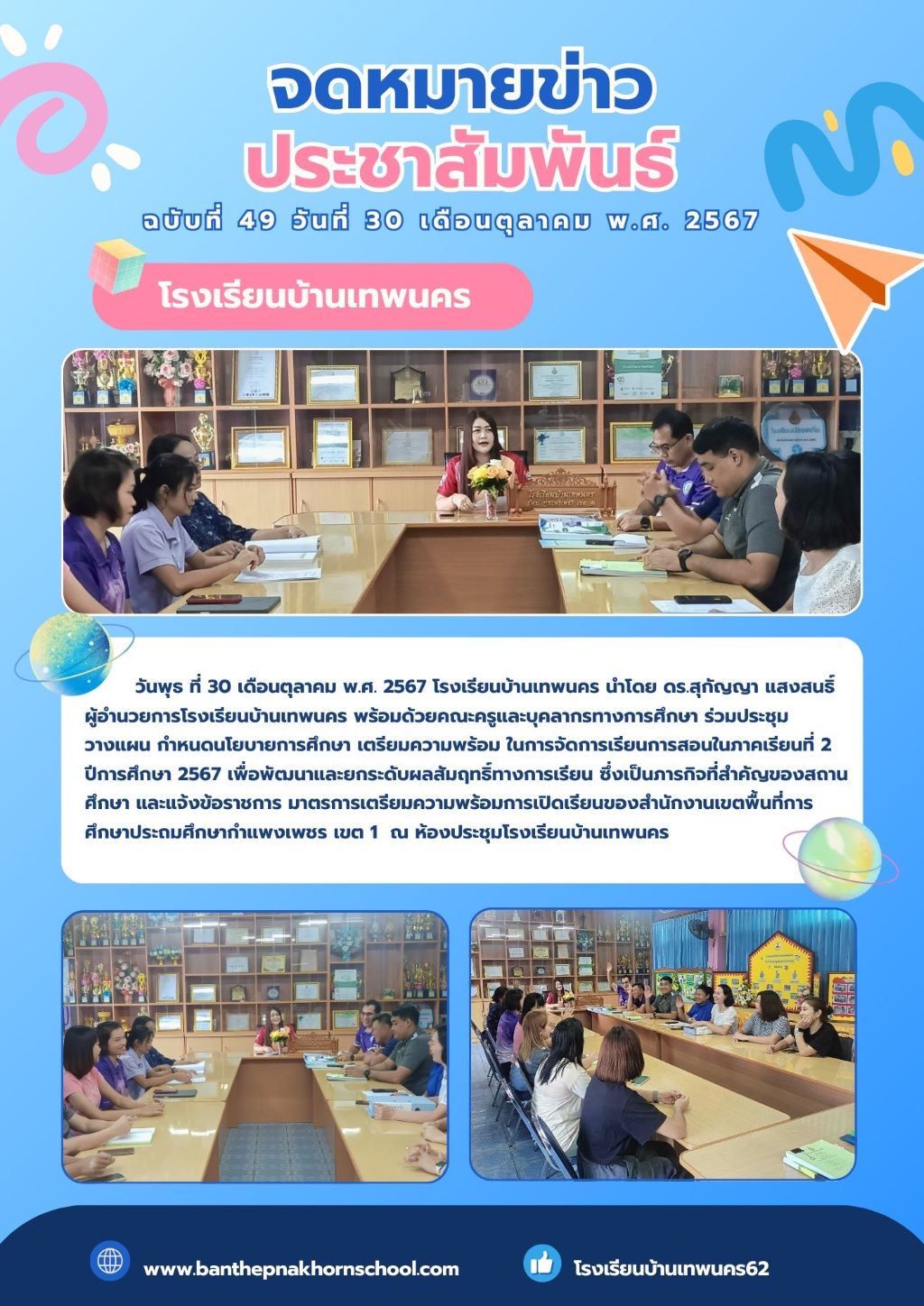 วันพุธ ที่ 30 เดือนตุลาคม พ.ศ. 2567 โรงเรียนบ้านเทพนคร นำโดย ดร.สุกัญญา แสงสนธิ์ ผู้อำนวยการโรงเรียนบ้านเทพนคร พร้อมด้วยคณะครูและบุคลากรทางการศึกษา ร่วมประชุมวางแผน กำหนดนโยบายการศึกษา เตรียมความพร้อม ในการจัดการเรียนการสอนในภาคเรียนที่ 2