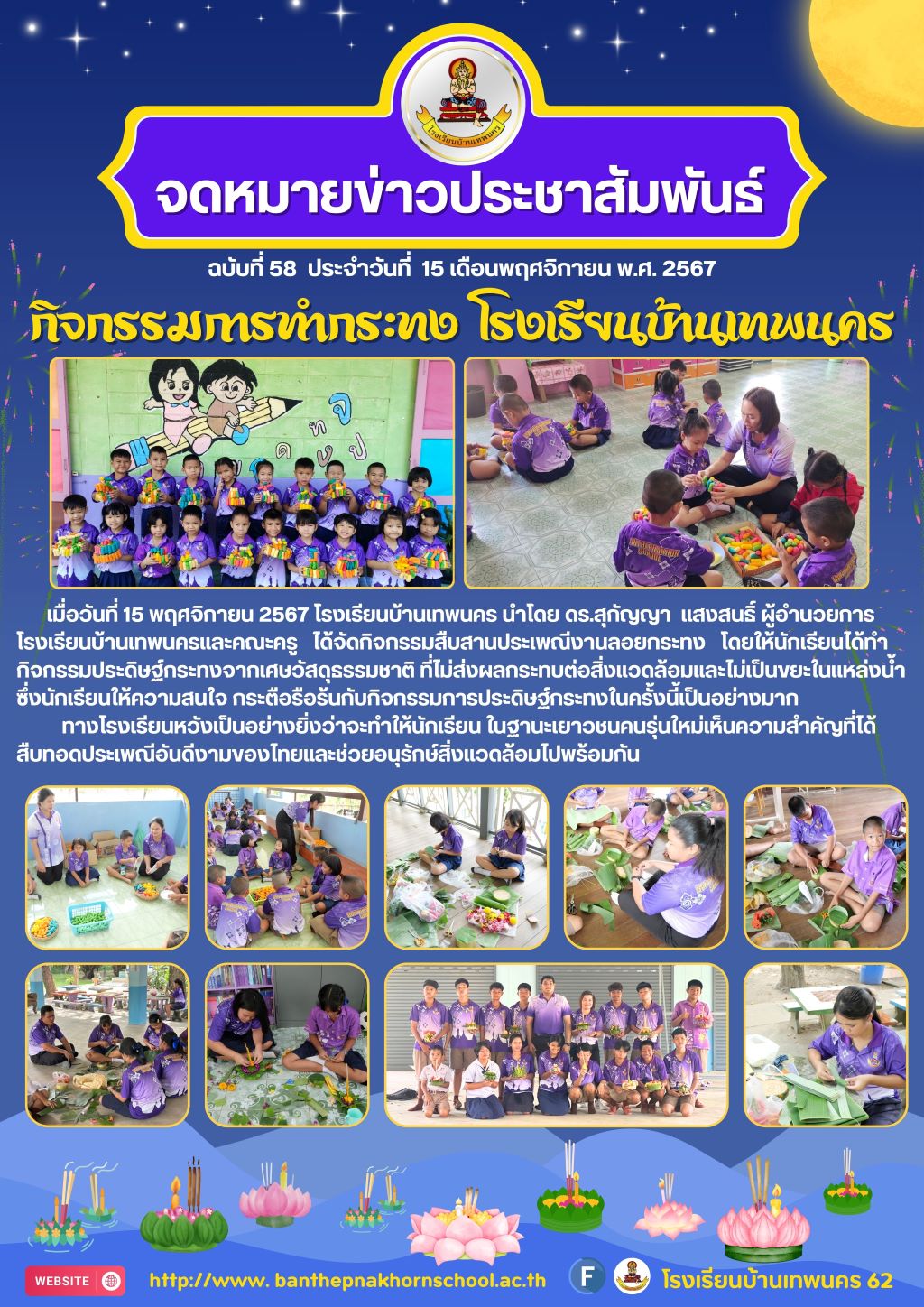 ได้จัดกิจกรรมสืบสานประเพณีงานลอยกระทง โดยให้นักเรียนได้ทำกิจกรรมประดิษฐ์กระทงจากเศษวัสดุธรรมชาติ ที่ไม่ส่งผลกระทบต่อสิ่งแวดล้อมและไม่เป็นขยะในแหล่งน้ำ ซึ่งนักเรียนให้ความสนใจ กระตือรือร้นกับกิจกรรมการประดิษฐ์กระทงในครั้งนี้เป็นอย่างมากทางโรงเรียนหวังเป็นอย่างยิ่งว่าจะทำให้นักเรียน ในฐานะเยาวชนคนรุ่นใหม่เห็นความสำคัญที่ได้สืบทอดประเพณีอันดีงามของไทยและช่วยอนุรักษ์สิ่งแวดล้อมไปพร้อมกัน