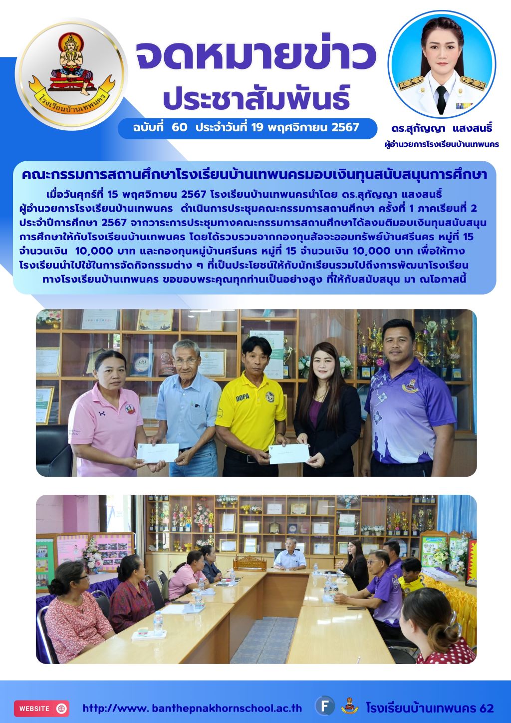 เมื่อวันศุกร์ที่ 15 พฤศจิกายน 2567 โรงเรียนบ้านเทพนครนำโดย ดร.สุกัญญา แสงสนธิ์ ผู้อำนวยการโรงเรียนบ้านเทพนคร ดำเนินการประชุมคณะกรรมการสถานศึกษา ครั้งที่ 1 ภาคเรียนที่ 2 ประจำปีการศึกษา 2567 จากวาระการประชุมทางคณะกรรมการสถานศึกษาได้ลงมติมอบเงินทุนสนับสนุนการศึกษาให้กับโรงเรียนบ้านเทพนคร โดยได้รวบรวมจากกองทุนสัจจะออมทรัพย์บ้านศรีนคร หมู่ที่ 15 จำนวนเงิน 10,000 บาท และกองทุนหมู่บ้านศรีนคร หมู่ที่ 15 จำนวนเงิน 10,000 บาท เพื่อให้ทางโรงเรียนนำไปใช้ในการจัดกิจกรรมต่าง ๆ ที่เป็นประโยชน์ให้กับนักเรียนรวมไปถึงการพัฒนาโรงเรียน ทางโรงเรียนบ้านเทพนคร ขอขอบพระคุณทุกท่านเป็นอย่างสูง