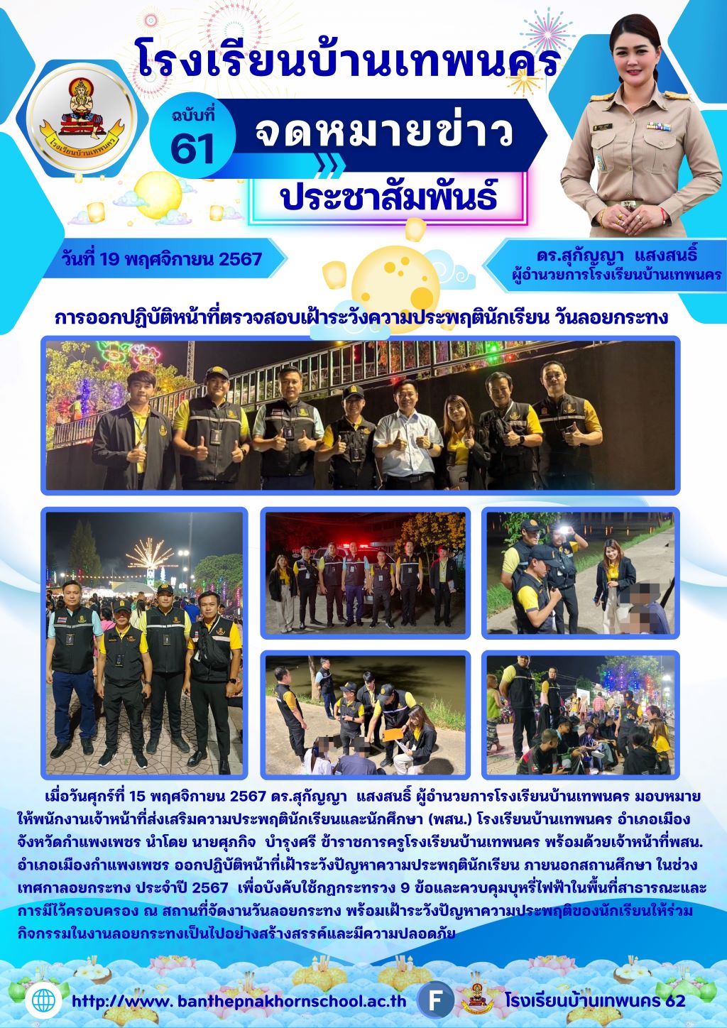 | เมื่อวันศุกร์ที่ 15 พฤศจิกายน 2567 ดร.สุกัญญา แสงสนธิ์ ผู้อำนวยการโรงเรียนบ้านเทพนคร มอบหมายให้พนักงานเจ้าหน้าที่ส่งเสริมความประพฤตินักเรียนและนักศึกษา (พสน.) โรงเรียนบ้านเทพนคร อำเภอเมืิอง จังหวัดกำแพงเพชร นายศุภกิจ บำรุงศรี ข้าราชการครูโรงเรียนบ้านเทพนคร พร้อมด้วยเจ้าหน้าที่พสน.อำเภอเมืองกำแพงเพชร ออกปฏิบัติหน้าที่เฝ้าระวังปัญหาความประพฤตินักเรียน ภายนอกสถานศึกษา ในช่วงเทศกาลอยกระทง ประจำปี 2567 เพื่อบังคับใช้กฏกระทรวง 9 ข้อและควบคุมบุหรี่ไฟฟ้าในพื้นที่สาธารณะและการมีไว้ครอบครอง ณ สถานที่จัดงานวันลอยกระทง พร้อมเฝ้าระวังปัญหาความประพฤติของนักเรียนให้ร่วมกิจกรรมในงานลอยกระทงเป็นไปอย่างสร้างสรรค์และมีความปลอดภัย |