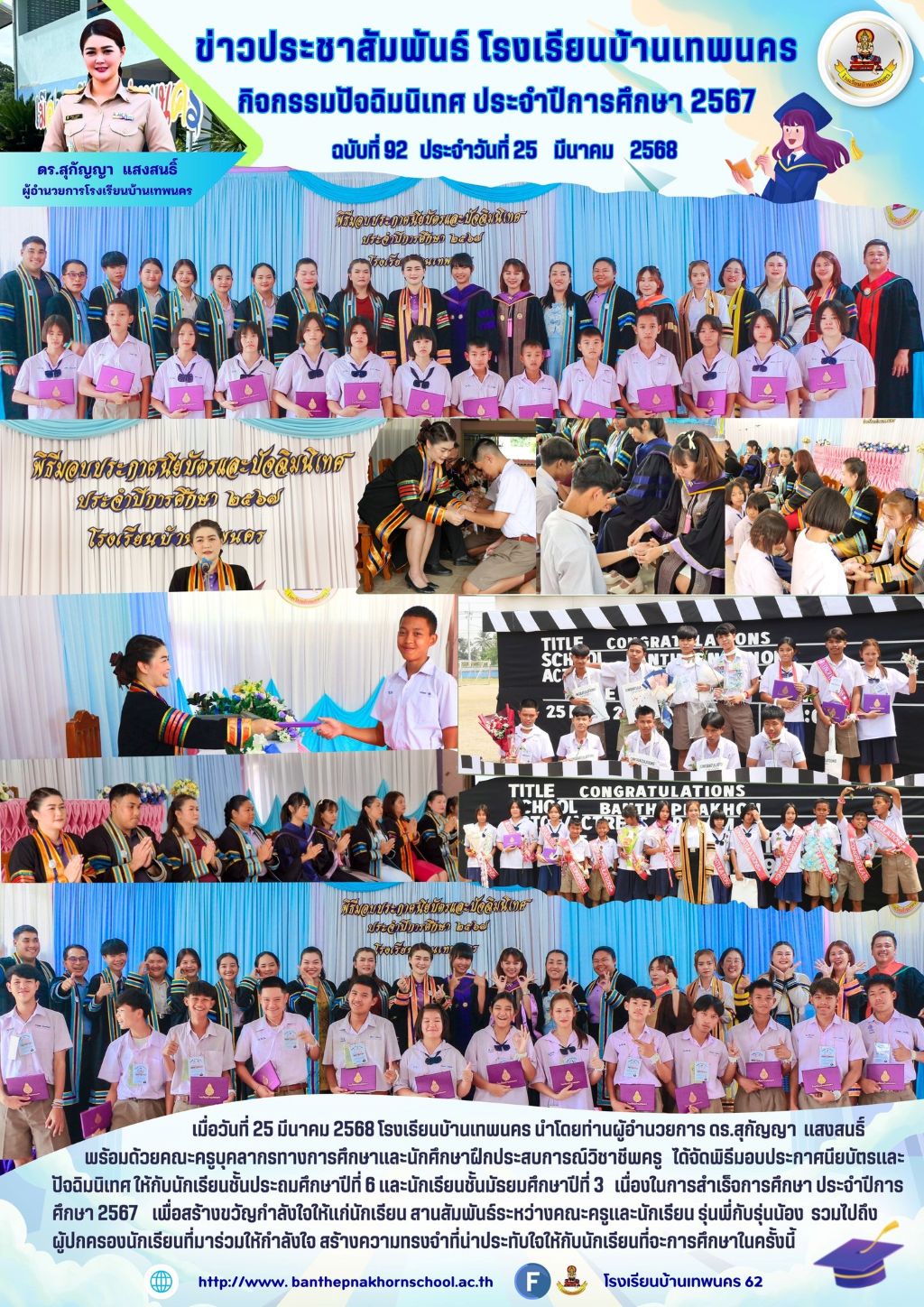 | เมื่อวันที่ 25 มีนาคม 2568 โรงเรียนบ้านเทพนคร นำโดยท่านผู้อำนวยการ ดร.สุกัญญา แสงสนธิ์ พร้อมด้วยคณะครูบุคลากรทางการศึกษาและนักศึกษาฝึกประสบการณ์วิชาชีพครู ได้จัดพิธีมอบประกาศนียบัตรและปัจฉิมนิเทศ ให้กับนักเรียนชั้นประถมศึกษาปีที่ 6 และนักเรียนชั้นมัธยมศึกษาปีที่ 3 เนื่องในการสำเร็จการศึกษา ประจำปีการศึกษา 2567 เพื่อสร้างขวัญกำลังใจให้แก่นักเรียน สานสัมพันธ์ระหว่างคณะครูและนักเรียน รุ่นพี่กับรุ่นน้อง รวมไปถึงผู้ปกครองนักเรียนที่มาร่วมให้กำลังใจ สร้างความทรงจำที่น่าประทับใจให้กับนักเรียนที่จะการศึกษาในครั้งนี้ |