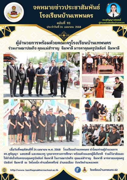 | เมื่อวันที่พฤหัสบดีที่ 24 เมษายน พ.ศ. 2568 โรงเรียนบ้านเทพนคร นำโดยท่านผู้อำนวยการ ดร.สุกัญญา แสงสนธิ์ และคณะครู บุคลากรทางการศึกษา พร้อมด้วยแขกผู้มีเกียรติ ร่วมไว้อาลัยและให้กำลังใจกับครอบคุณครูบัลลังก์ ฉิมพาลี ในงานฌาปนกิจ คุณแม่สำราญ ฉิมพาลี มารดาของคุณครูบัลลังก์ ฉิมพาลี ณ วัดโนนโก ตำบลไตรตรึงษ์ อำเภอเมือง จังหวัดกำแพงเพชร |