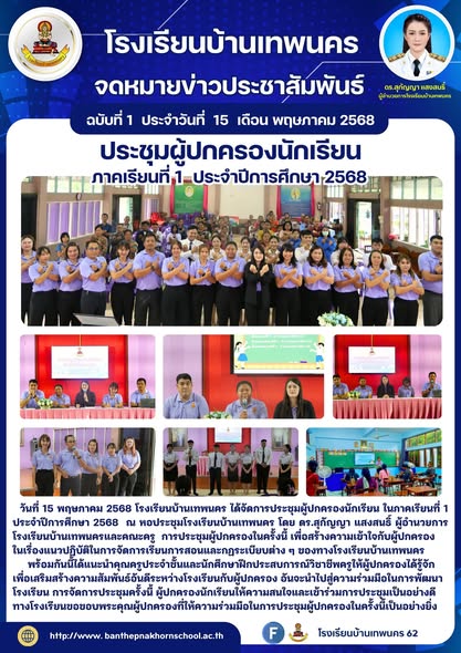 | วันที่ 15 พฤษภาคม 2568 โรงเรียนบ้านเทพนคร ได้จัดการประชุมผู้ปกครองนักเรียน ในภาคเรียนที่ 1 ประจำปีการศึกษา 2568 ณ หอประชุมโรงเรียนบ้านเทพนคร โดย ดร.สุกัญญา แสงสนธิ์ ผู้อำนวยการโรงเรียนบ้านเทพนครและคณะครู การประชุมผู้ปกครองในครั้งนี้ เพื่อสร้างความเข้าใจกับผู้ปกครองในเรื่องแนวปฏิบัติในการจัดการเรียนการสอนและกฏระเบียบต่าง ๆ ของทางโรงเรียนบ้านเทพนคร พร้อมกันนี้ได้แนะนำคุณครูประจำชั้นและนักศึกษาฝึกประสบการณ์วิชาชีพครูให้ผู้ปกครองได้รู้จัก เพื่อเสริมสร้างความสัมพันธ์อันดีระหว่างโรงเรียนกับผู้ปกครอง อันจะนำไปสู่ความร่วมมือในการพัฒนาโรงเรียน การจัดการประชุมครั้งนี้ ผู้ปกครองนักเรียนให้ความสนใจและเข้าร่วมการประชุมเป็นอย่างดี ทางโรงเรียนขอขอบพระคุณผู้ปกครองที่ให้ความร่วมมือในการประชุมผู้ปกครองในครั้งนี้เป็นอย่างยิ่ง |