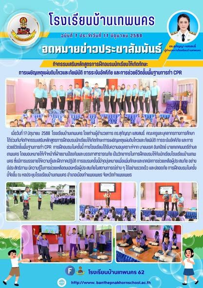 | เมื่อวันที่ 17 มิถุนายน 2568 โรงเรียนบ้านเทพนคร โดยท่านผู้อำนวยการ ดร.สุกัญญา แสงสนธิ์ คณะครูและบุคลากรทางการศึกษา ได้ร่วมกันจัดกิจกรรมเสริมหลักสูตรการฝึกอบรมนักเรียนให้เกิดทักษะการเผชิญเหตุแผ่นดินไหวและภัยพิบัติ การระงับอัคคีภัย และการช่วยชีวิตขั้นพื้นฐานการทำ CPR การฝึกอบรมในครั้งนี้ ทางโรงเรียนได้รับความอนุเคราะห์จาก นายนเรศ อินทปัตย์ นายกเทศมนตรีตำบลเทพนคร โดยมอบหมายให้เจ้าหน้าที่ฝ่ายงานป้องกันและบรรเทาสาธารณภัย เป็นวิทยากรในการฝึกอบรมให้กับนักเรียนโรงเรียนบ้านเทพนคร ซึ่งมีการบรรยายให้ความรู้และฝึกภาคปฏิบัติ การอบรมครั้งนี้มีจุดมุ่งหมายเพื่อเพิ่มทักษะและเทคนิคการช่วยเหลือผู้ประสบภัย อย่างมีประสิทธิภาพ มีความรู้ในการช่วยเหลือตนเองหรือผู้ประสบภัยในสถานการณ์ต่าง ๆ ได้อย่างรวดเร็ว และปลอดภัย การฝึกอบรมในครั้งนี้จัดขึ้น ณ หอประชุมโรงเรียนบ้านเทพนคร อำเภอเมืองกำแพงเพชร จังหวัดกำแพงเพช |