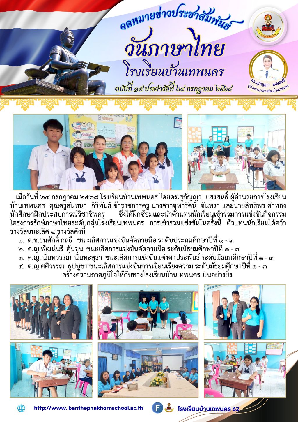 เมื่อวันที่ ๒๔ กรกฎาคม ๒๕๖๘ โรงเรียนบ้านเทพนคร โดยดร.สุกัญญา แสงสนธิ์ ผู้อำนวยการโรงเรียนบ้านเทพนคร คุณครูสันทนา กิวิพันธ์ ข้าราชการครู นางสาวจุฬารัตน์ จันทรา และนายสิทธิพร คำทอง นักศึกษาฝึกประสบการณ์วิชาชีพครู ซึ่งได้ฝึกซ้อมและนำตัวแทนนักเรียนเข้าร่วมการแข่งขันกิจกรรมโครงการรักษ์ภาษาไทยระดับกลุ่มโรงเรียนเทพนคร การเข้าร่วมแข่งขันในครั้งนี้ ตัวแทนนักเรียนได้คว้ารางวัลชนะเลิศ ๔ รางวัลดังนี้