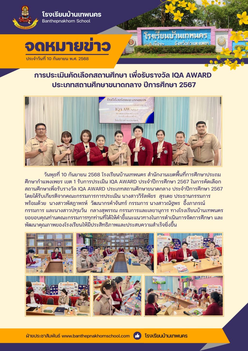 นพุธที่ 10 กันยายน 2568 โรงเรียนบ้านเทพนคร สำนักงานเขตพื้นที่การศึกษาประถมศึกษากำแพงเพชร เขต 1 รับการประเมิน IQA AWARD ประจำปีการศึกษา 2567 ในการคัดเลือกสถานศึกษาเพื่อรับรางวัล IQA AWARD ประเภทสถานศึกษาขนาดกลาง ประจำปีการศึกษา 2567 โดยได้รับเกียรติจากคณะกรรมการการประเมิน นางสาววิรัลพัชร สุรเดช ประธานกรรมการ พร้อมด้วย นางสาวพัสฏาพรห์ วัฒนากรคำจันทร์ กรรมการ นางสาวณัฐพร อึ้งภาภรณ์ กรรมการ และนางสาวปทุมวัน กลางสุพรรณ กรรมการและเลขานุการ