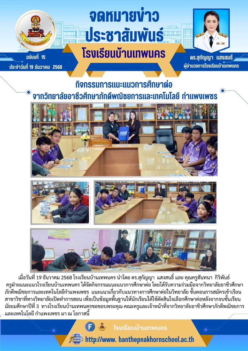 กิจกรรมแนะแนวการศึกษาต่อ โดยได้รับความร่วมมือจากวิทยาลัยอาชีวศึกษาภักดีพณิชยการและเทคโนโลยีกำแพงเพชร