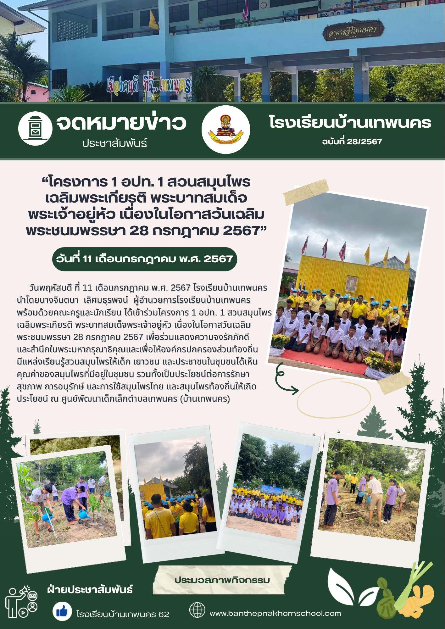ผู้อำนวยการโรงเรียนบ้านเทพนคร พร้อมด้วยคณะครูและนักเรียน ได้เข้าร่วมโครงการ 1 อปท. 1 สวนสมุนไพร เฉลิมพระเกียรติ พระบาทสมเด็จพระเจ้าอยู่หัว เนื่องในโอกาสวันเฉลิมพระชนมพรรษา 28 กรกฎาคม 2567